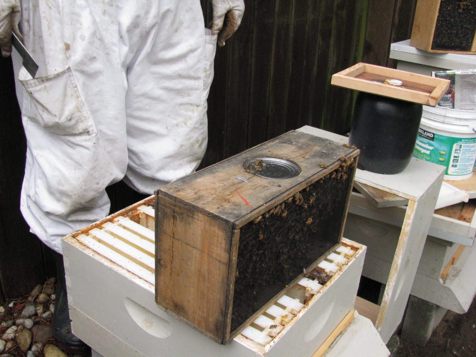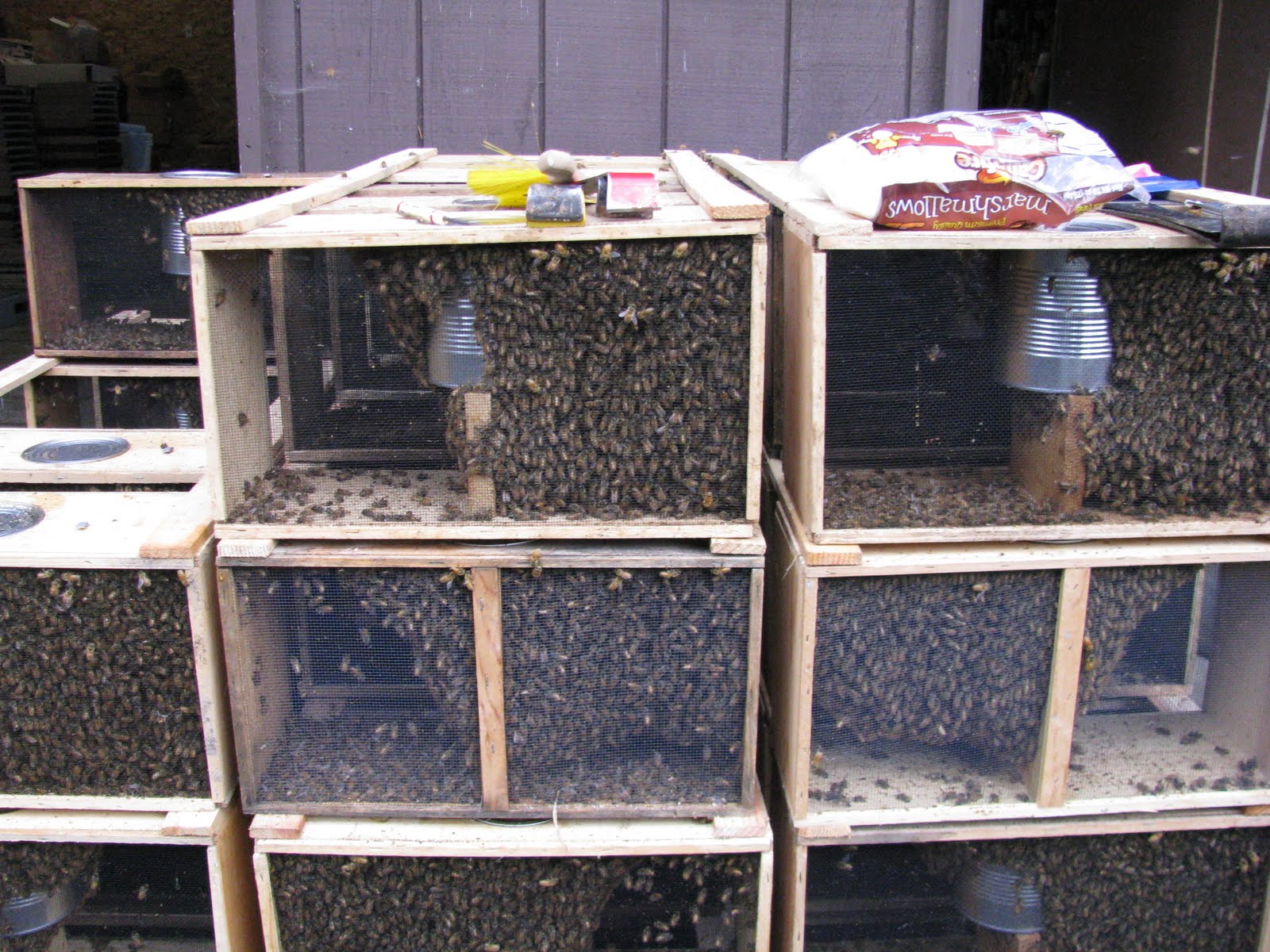 One of the members of the Puget Sound Beekeepers invited club members to his place to help install over 100 boxes of bees. Pictured above are some of the boxes waiting to be put in a hive.