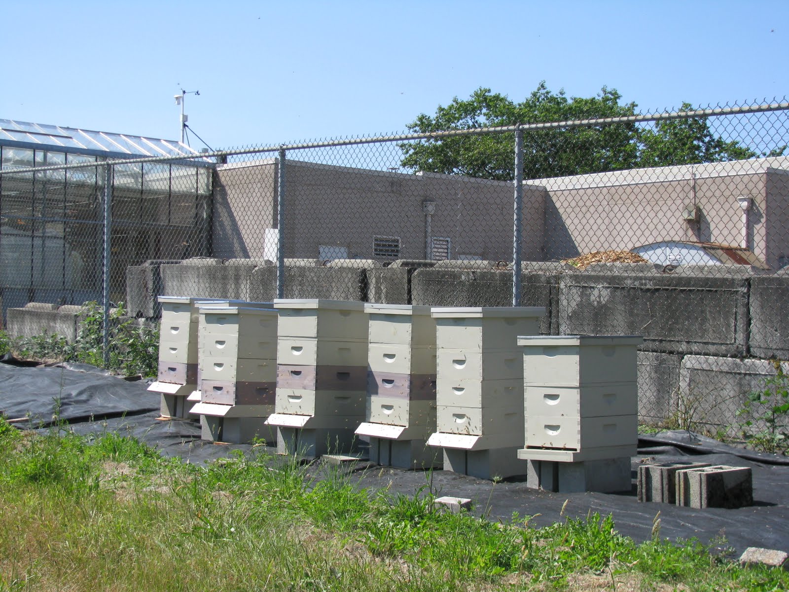 These seven hives are at the Urban Horticulture Center on the University of Washington campus. The hive on the far right is the swarm hive that was featured in the previous blog. It is coming right along. The hive on the far left is the hive that swarmed. We know this because it ended up without a viable queen. The old queen flies off with the swarm. The remaining hive is left with queen cells (pupa cases) about to hatch another queen. That new queen must go around and kill the other queens about to hatch. If she misses one, then there is often a secondary swarm with an unmated queen. We did have a second swarm at that site so it could be that the hive ended up without a queen. Our last inspection of the far left hive showed that there were no eggs, no larva and no brood (pupa cases). That means no active queen.