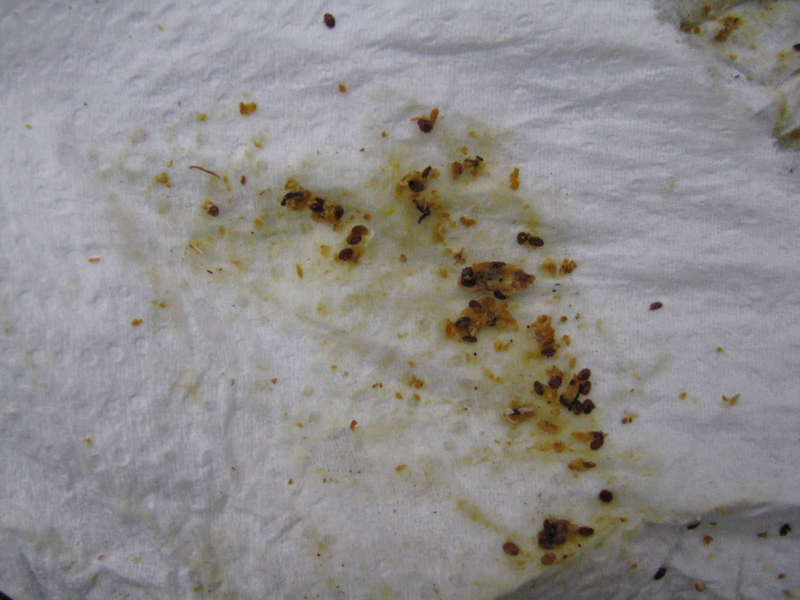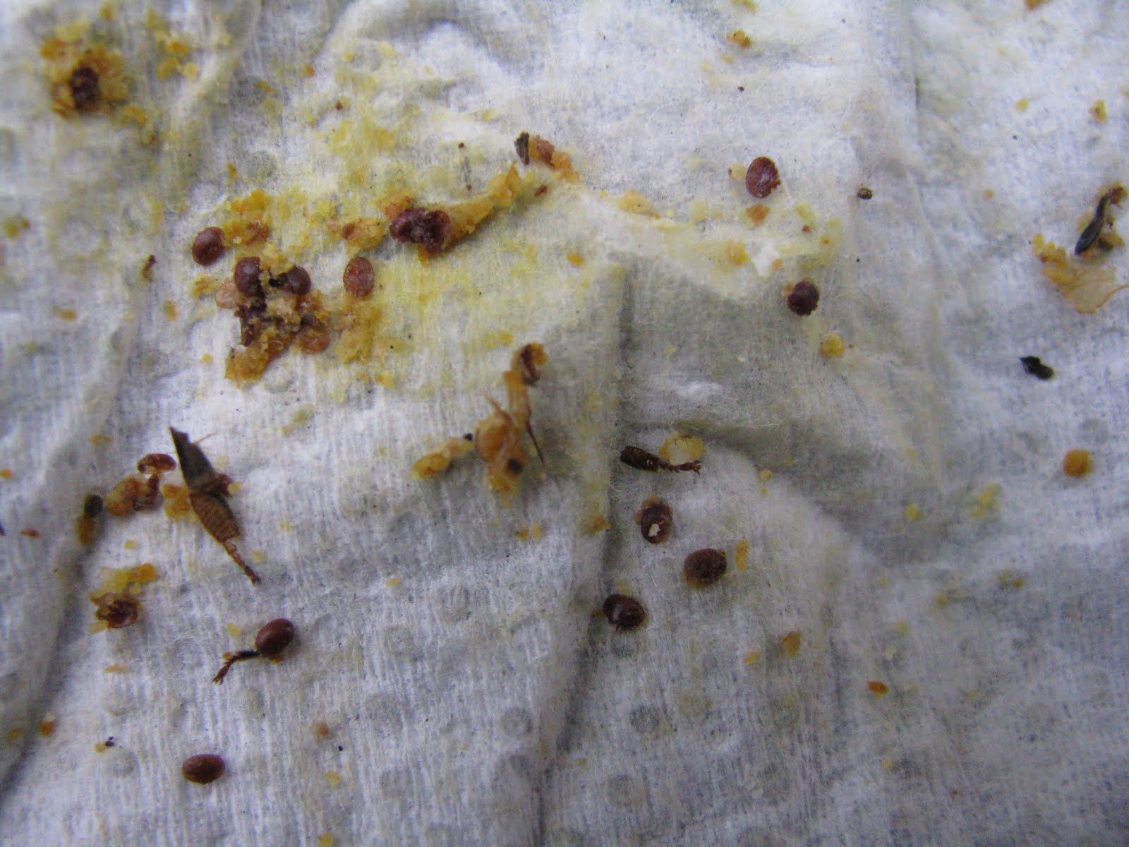 The photos above are of dead varroa mites that have been wiped off of a collection board left under the screened bottom board of a hive.