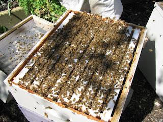 We were just delighted to get into our hives in late March and find that most of them had survived. This is a good-looking bunch of bees ready to go after the first pollen and nectar that they can find.
