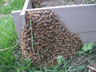 We had lots and lots and lots of swarms in late April and early May this year. They were all from our own hives as far as I know. This was the weirdest swarm. It left the hive on a rainy day and landed on the edge of a garden bed. Our happy news this year is that we lost only 4 out of 24 hives last winter. The previous winter we had lost 18 of 19 hives so this was a great improvement. The big loss was probably from colony collapse. This winter losses were from running out of food. Our hives looked really robust when we went through them in March. Some of them were making bees like crazy as we found out when they started to swarm. We currently have 34 hives. We bought 5 packages so that means that we caught 13 swarms. Twice, we caught 2 swarms in one day.