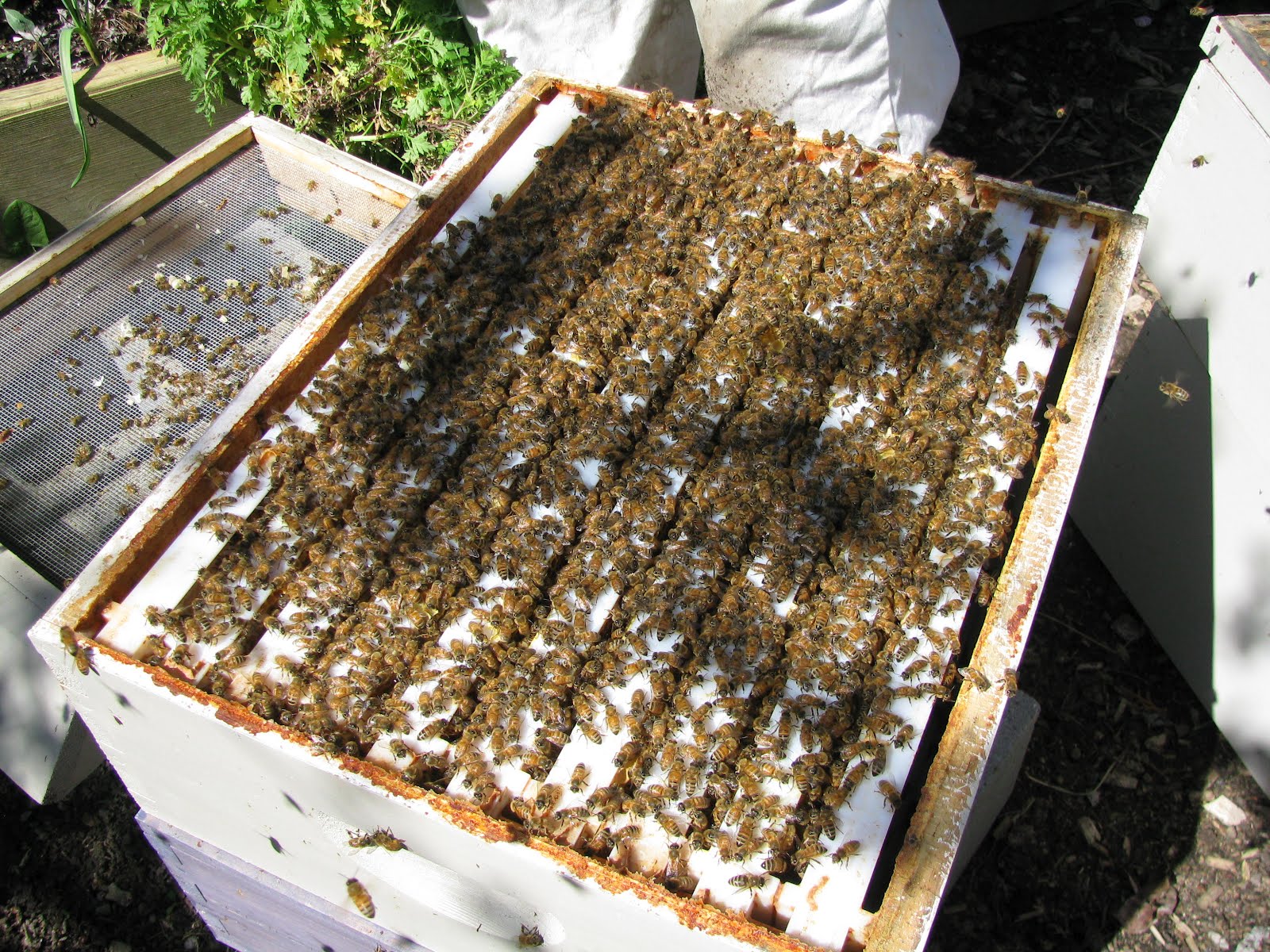 We were just delighted to get into our hives in late March and find that most of them had survived. This is a good-looking bunch of bees ready to go after the first pollen and nectar that they can find.
