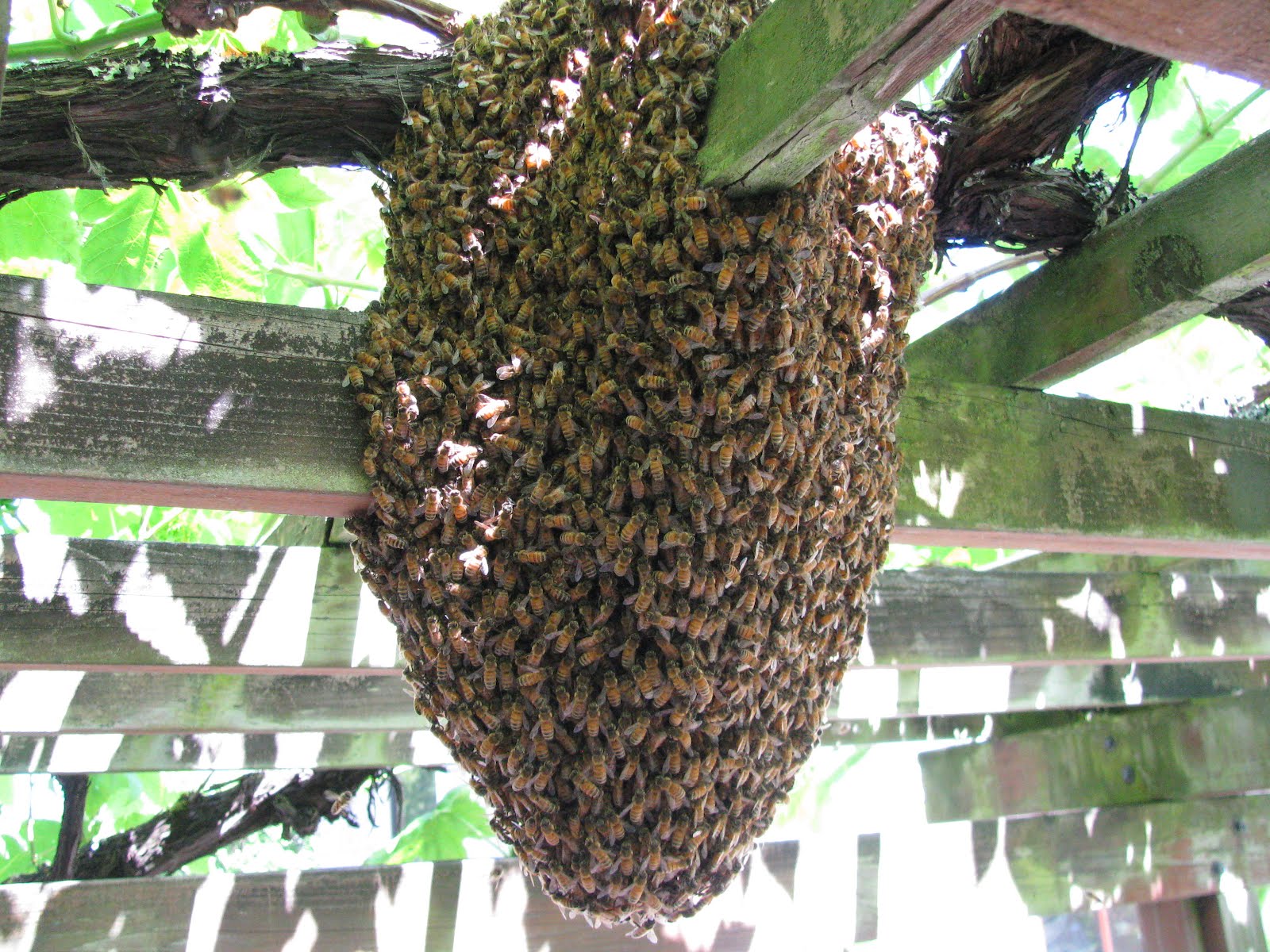 We had another swarm this past week. This swarm was a little tricky to get because of the structure of the grape arbor that it landed on. We ended up brushing them into a bucket and then dumping the bees into a waiting hive. We got the queen on the first try. We knew we had her because about 10 to 15 minutes after we put the bees into the hive, a bunch of bees started to fan at every entrance to the hive. The bees have a scent that they broadcast from their Nasenov gland by putting their rear ends up in the air and fanning their wings to tell the bees on the outside of the hive the location of the queen. Pretty soon the air was filled with bees leaving the swarm site headed for the hive. The hive sat on our picnic table until we could move the bees to an apiary that we have recently established in Carnation, Washington (about 25 east of Seattle).